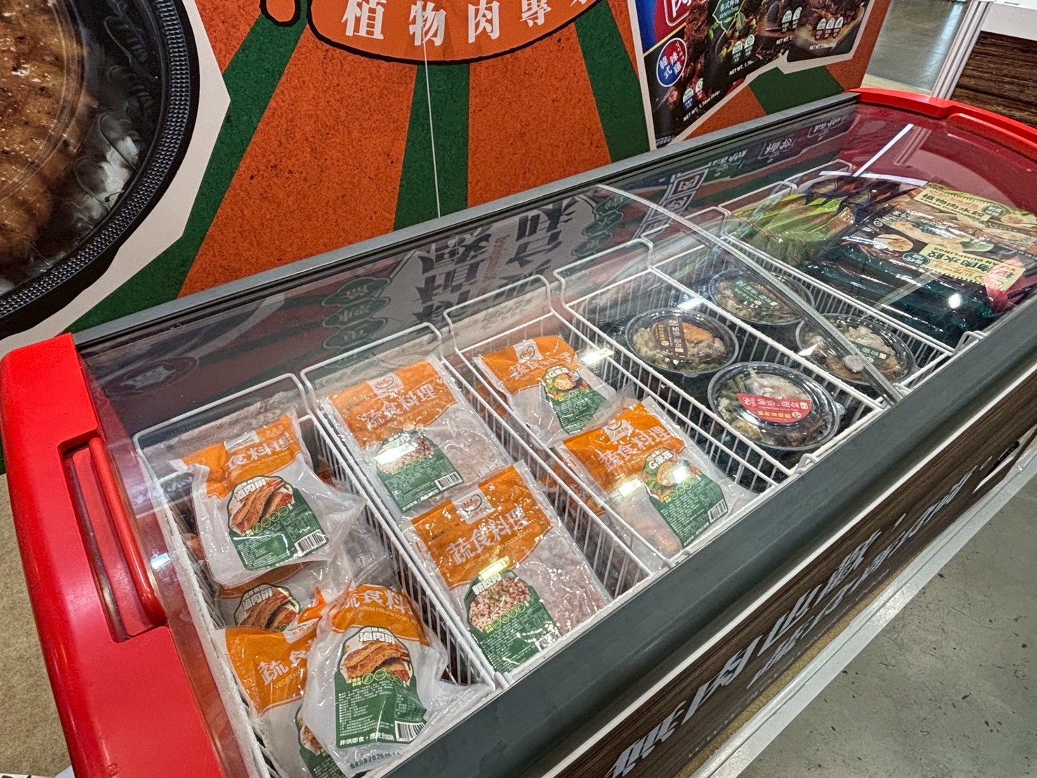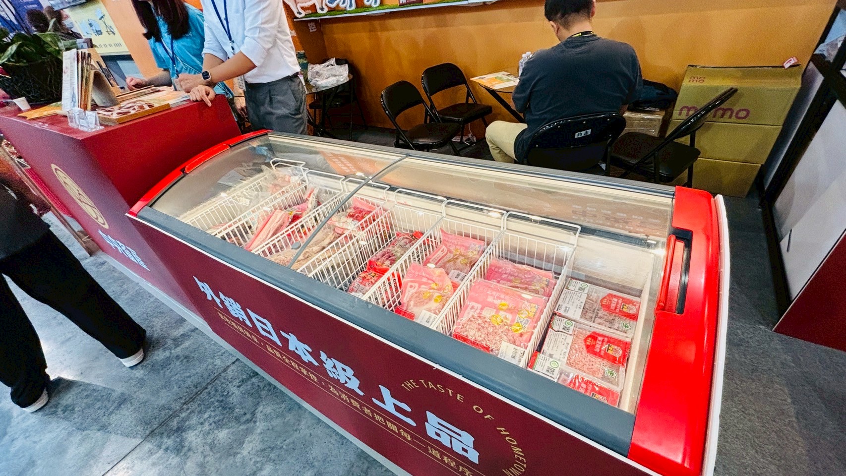 在展場中使用玻璃對拉冰櫃,最大優勢是視覺開放性高、取物便利,可從上方清楚看到所有商品