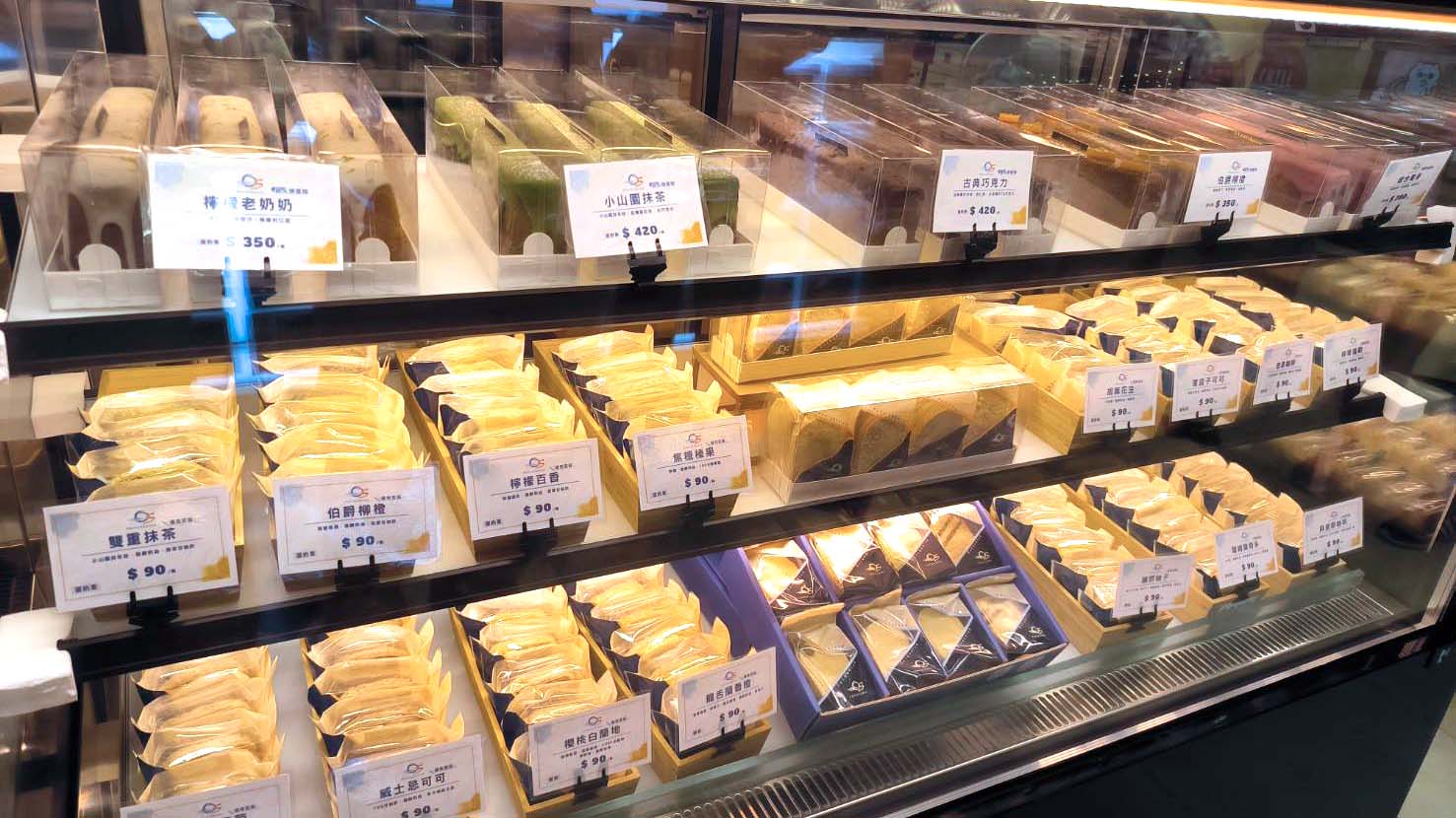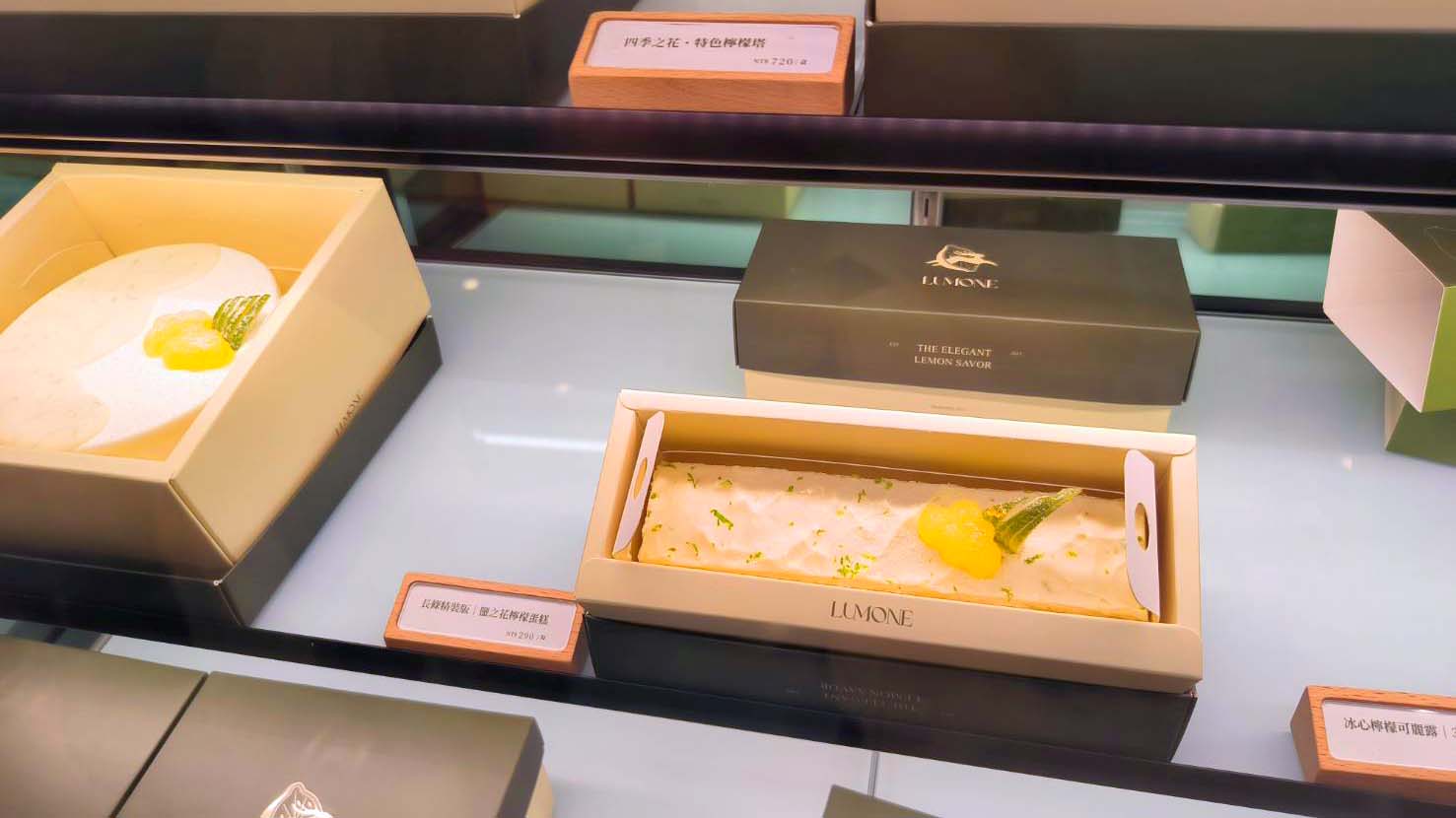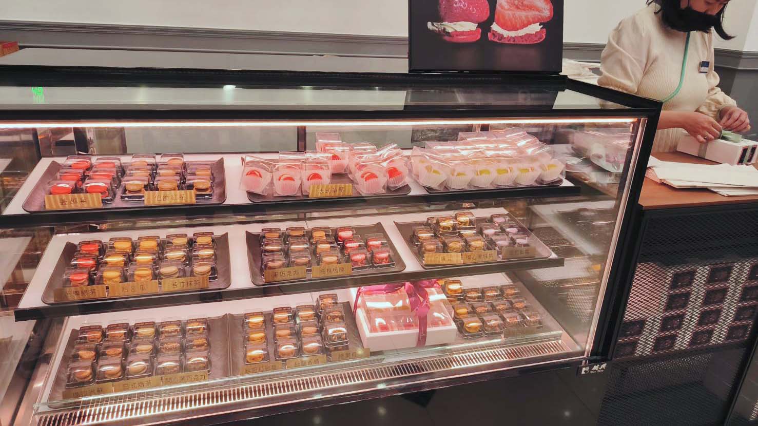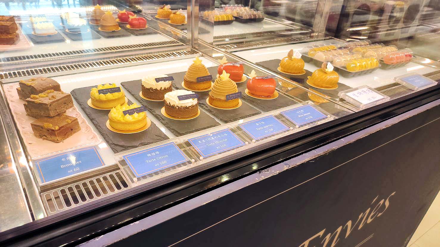 各式手工甜點、千層蛋糕、馬卡龍、塔類作品整齊擺放在玻璃櫃中,在燈光的襯托下像精品般閃閃發亮,細緻的層次、繽紛的色彩,一目了然,美得讓人忍不住多看幾眼!